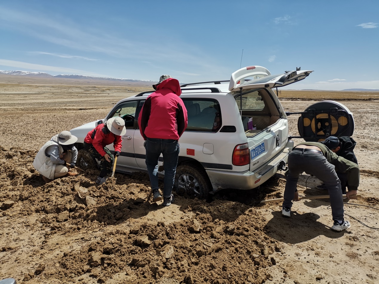 但道路不会永远平坦,科考永远充斥波折,采样过程中的插曲从不缺席,最折磨人的当属陷车,糟糕的时候两辆负重六吨的越野车深陷泥坑,不得动弹,轮胎被烂泥死死包裹,排气筒被河水深深浸泡,车头无助的仰天长啸,唯有五位突击队员协同司机并肩作战,挥铁锹、打千斤、垫石头、挖深坑、拉钢绳……几次轮番作战,突击队员们浑身上下都沾满泥巴,如同刚从池塘钻出的泥鳅一般,最后终于将大车拉出。频繁的陷车让突击队员们从一开始的惊慌无措,被历练的从容淡定,甚至后面再遇陷车,有个队员打趣的说:“每天奔走光锻炼腿了,挖挖车锻炼胳膊算无氧运动,能长肌肉也是好事,我们追求德智体全面发展!”大伙刚刚爬满全身的疲倦就这样在一片笑声中被洗的干干净净。