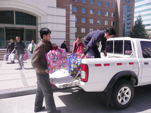 通过支援者的介绍,在了解到目前伤员仍需要大量的衣物、鞋子等生活用品的情况后,我所全所职工和研究生再次筹集捐赠活动,并于27日再次赶赴解放军第四医院,将二期捐赠的366件衣物等生活必须品送到灾区伤员手里。
