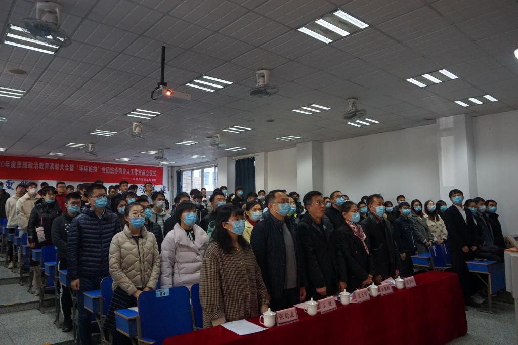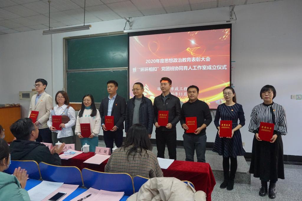 为深入学习贯彻全国教育大会和全国高校思想政治工作会议精神,更好的落实立德树人根本任务,积极培育和践行社会主义核心价值观,大力培养新时代大学生先进典型,同时进一步建立健全党团班协同育人工作机制,我院于11月23日在西配102成功举办2020年度思想政治教育表彰大会暨“环环相扣”党团班协同育人工作室成立仪式。校党委学工部、团委领导、校体育部老师及学院领导班子出席此次大会。