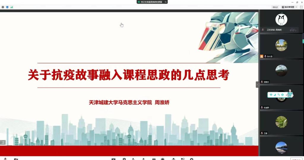 周淮娇老师结合环境学院疫情防控工作实际,从“于‘疫情’见‘真情’,超越叙事讲故事”“于‘危机’寻‘契机’,走出课堂做思政”“于‘细微’观‘大局’,跳出思政看育人”三个方面作了教学分享。会后,教师们研讨表示,要紧密联系学校疫情防控工作实际,以身边事感染身边人,将疫情封校期间我校党员、教师、辅导员们舍小家为大家的感人事迹和鲜活事例作为教学案例,融入课程思政,讲好中国故事、天津故事、城大故事,向学生讲述一个真实立体、全面生动的中国和可亲、可敬、可爱的城大,不断提高课程思政的实效性。