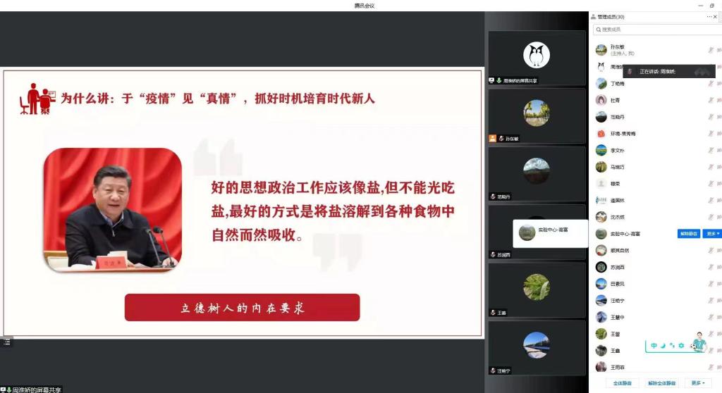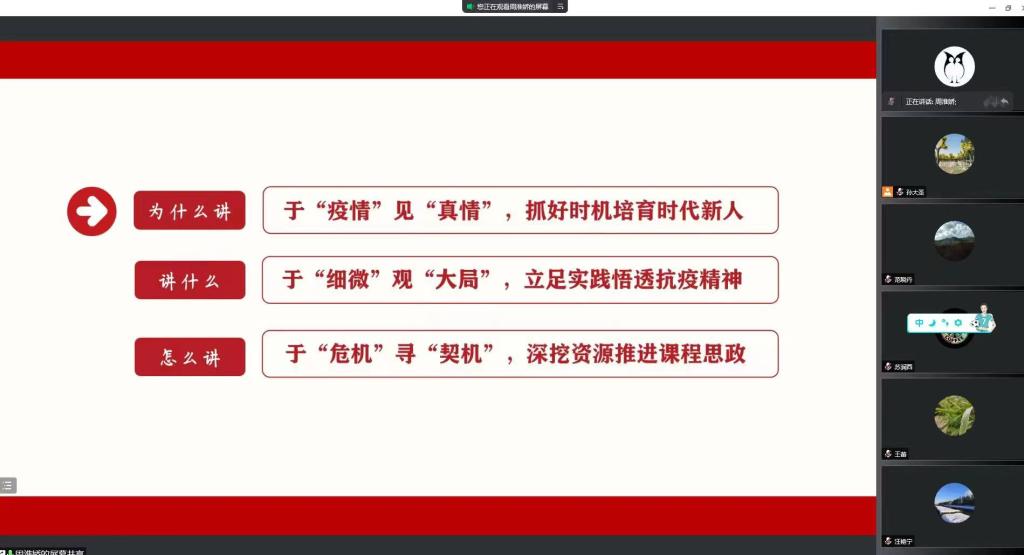 为了提升课程任课教师的课程思政意识,更好地发挥各门课程的育人功能,结合城大抗疫故事打造城大特色抗疫思政课,环境与市政工程学院积极响应学校教务处安排,搭建课程思政建设经验交流平台,邀请马克思主义学院周淮娇老师于4月25日开展主题为《关于抗疫故事融入课程思政的几点思考》的课程思政分享会,环境学院各系主任及30余位教师参会。