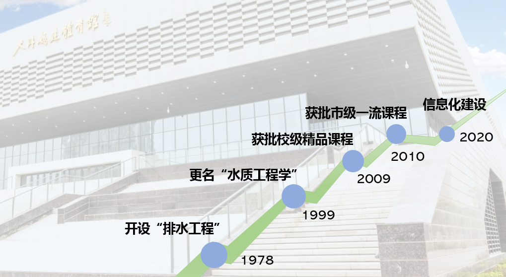 本课程前身为天津大学建筑分校(天津城建大学前身)成立之初开设的“排水工程”课程;2005年,课程由“排水工程”更名为“水质工程学(2)”;2008年,被评为校级精品课,课程网站建立并运行;2020年,获批天津市一流本科建设课程;给排水科学与工程专业获批国家级一流专业建设项目;2020年,课程组教师作为骨干成员的“水质科学与技术教学团队”获批天津市级教学团队;2021年,探索线上线下教学模式,采用雨课堂等信息化工具进行教学。