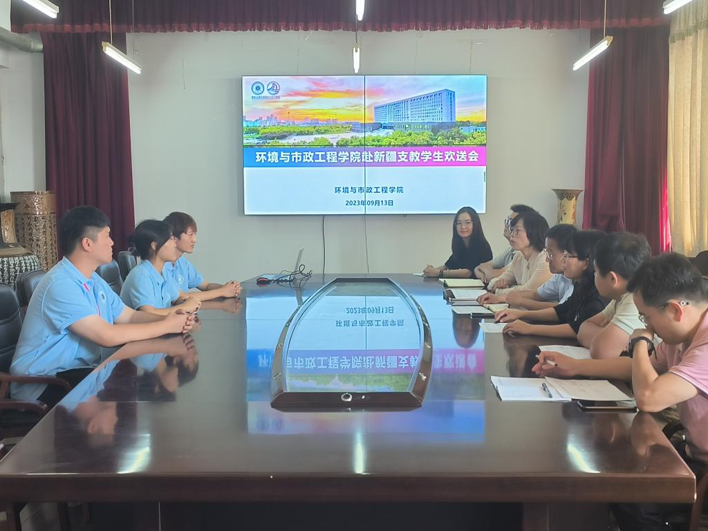 9月13日下午,环境与市政工程学院在行知楼426举办赴新疆支教学生欢送会。学院领导班子及系主任、学生工作教师及学院选派的3名新疆支教学生刘佳琪、伊桑昊东、张木易参会,会议由党委副书记沈杰然主持。