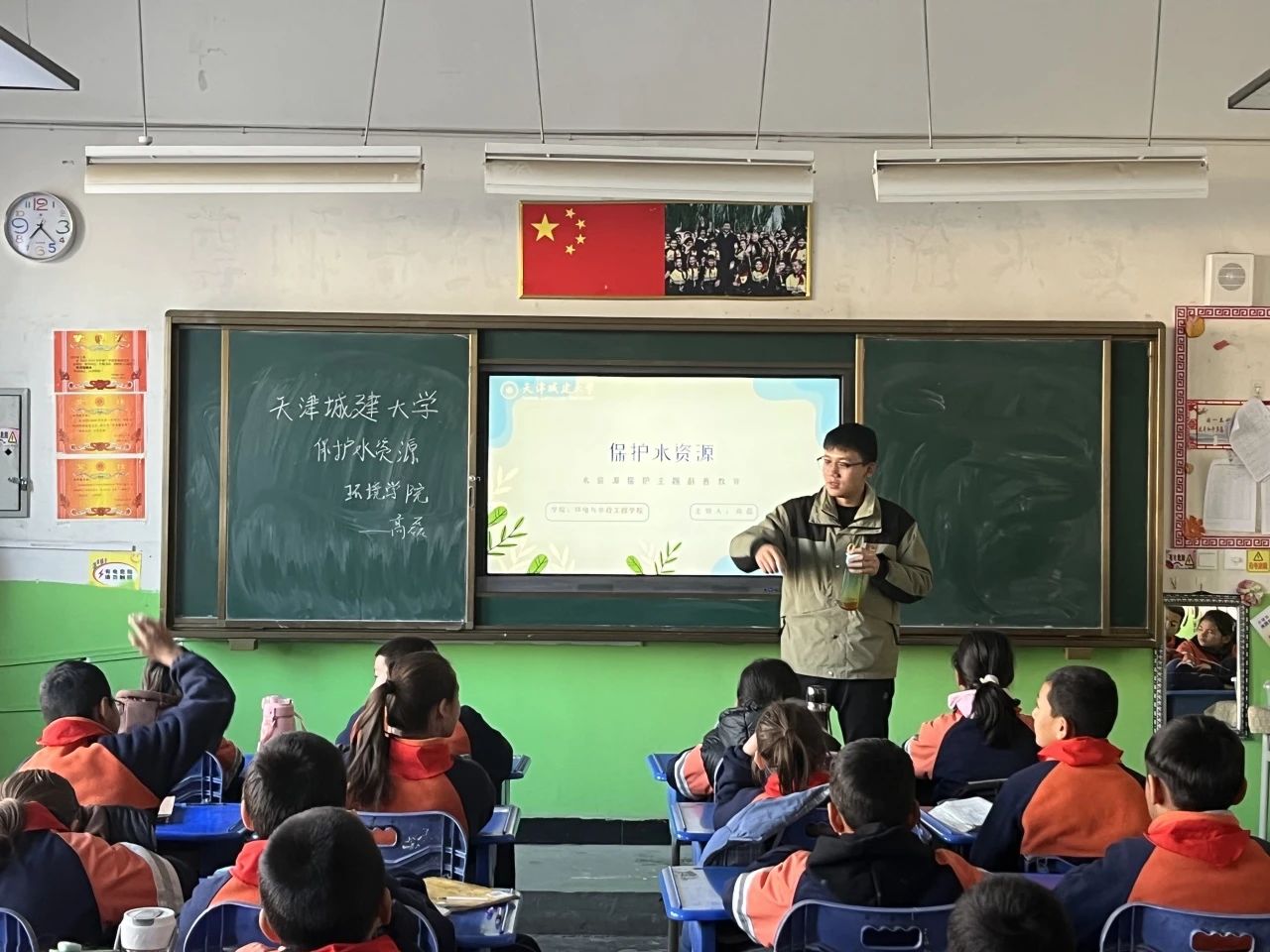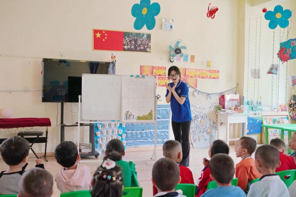 支教期间,三位同学发挥自身特长,扎根边疆一线,用自己的热爱持续闪闪发光,高磊同学用党员的严谨与担当投身基层党建工作;任江文同学带领孩子们在书法社中挥毫泼墨感受传统文化之魅;周昕卉同学自己作词谱曲用歌声唱出心中热爱。他们用行动诠释热爱,以青春奔赴“疆”来。