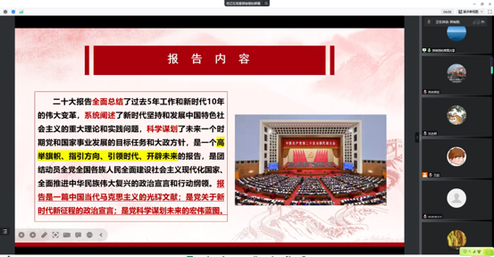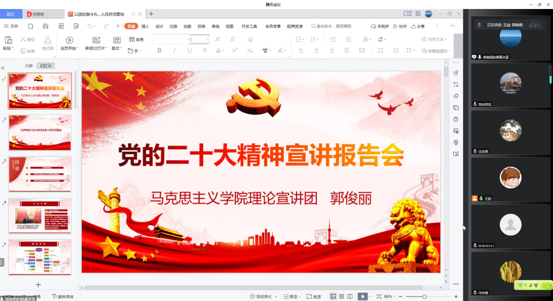 为进一步深入学习贯彻党的二十大精神,落实立德树人根本任务,将党的二十大精神一体贯通,有机融入课程思政,11月21日晚,环境与市政工程学院课程思政教学研究分中心举办党的二十大精神第三期集体备课会。学院副院长王喆主持会议,邀请马克思主义学院郭俊丽主讲,环境学院全体教师参会并开展交流发言。