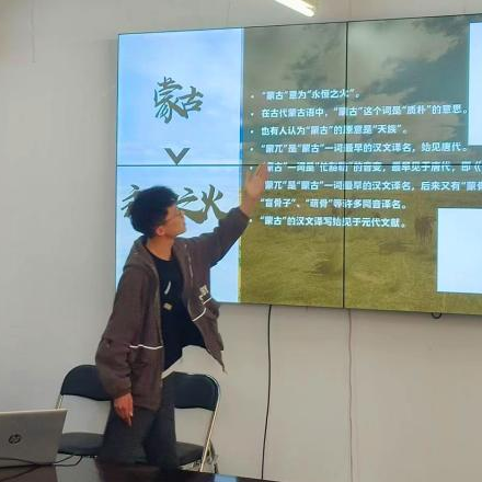2022级环境工程专业的蒙古族学生张文学,来自山海之间的辽宁省,这个性格开朗、认真负责的男孩儿向同学们分享了蒙古族独特的蒙医文化、悠久的文化绘画艺术、传统的蒙古族语言,并现场教授大家蒙古族语言“毕其玛都海日泰”(我爱你)的发音方法,与会师生练习非常投入。