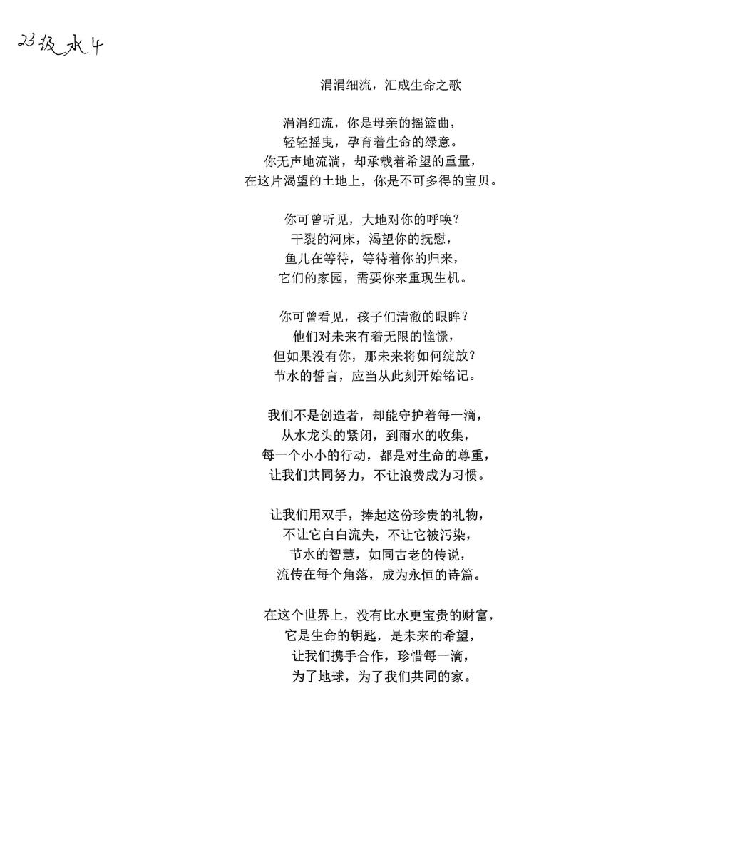 通过宣传节约用水理念,同学们积极学习节水知识,树立节水观念,以现代诗歌、宣传标语、画作等形式展现出节约用水的学习成果,并学以致用,在生活中注意每个节水环节,做到以自身成为榜样,以自我渲染他人。让更多同学加入到节水行动中来,共同建设水资源节约型社会。