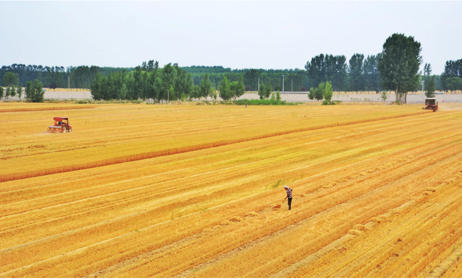 农户与收割机配合作业,在田中整理麦垛。吕占民 摄
