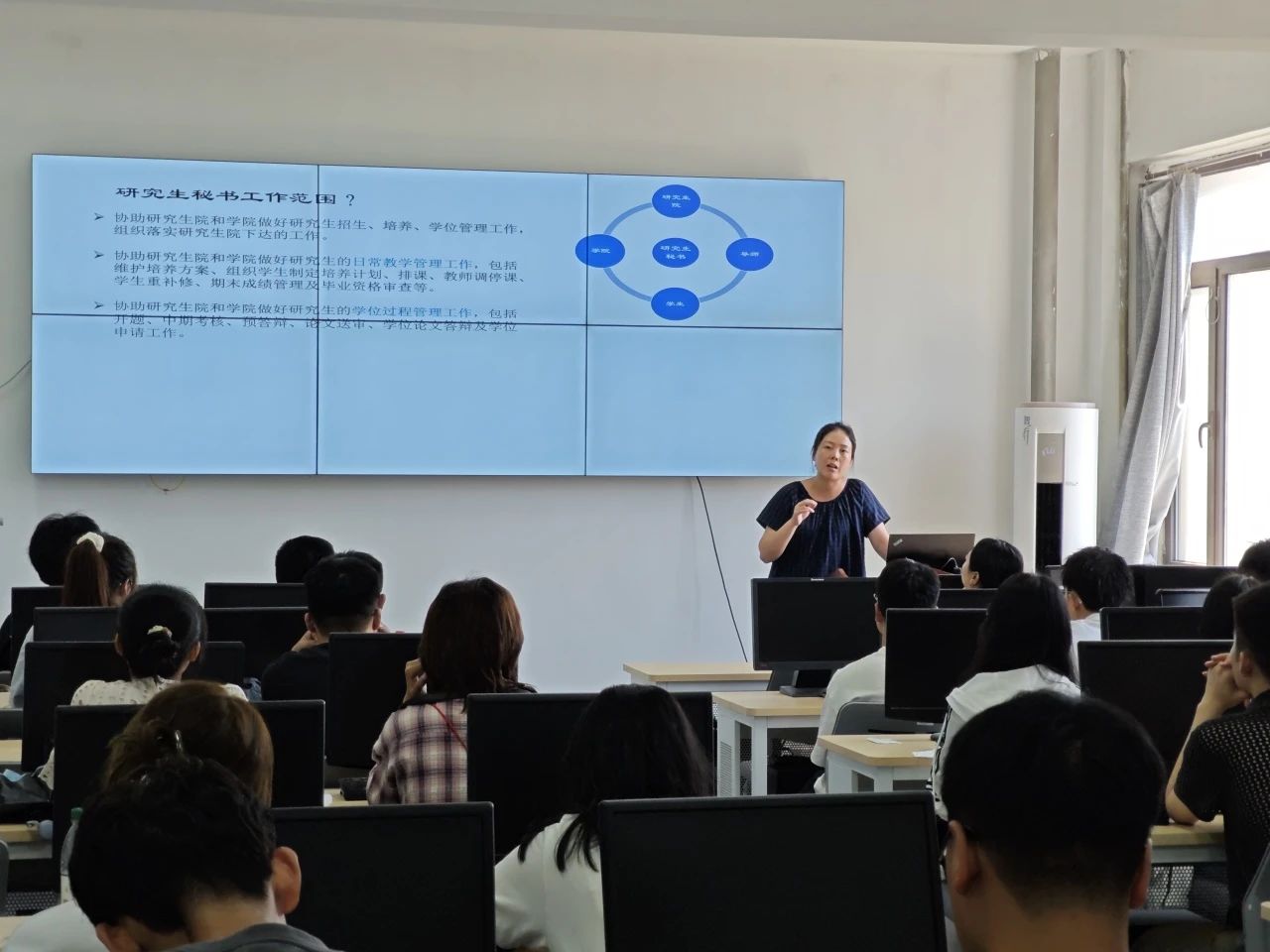 研究生秘书钟玲玲老师详细为同学们介绍学业相关流程细节,并着重强调研究生学位管理规定与学术道德规范指导、研究生培养管理规定解读与学业规划指导。学办马月轩、赵博宇老师分别为同学们介绍学生工作内容及后续服务管理工作的开展情况。