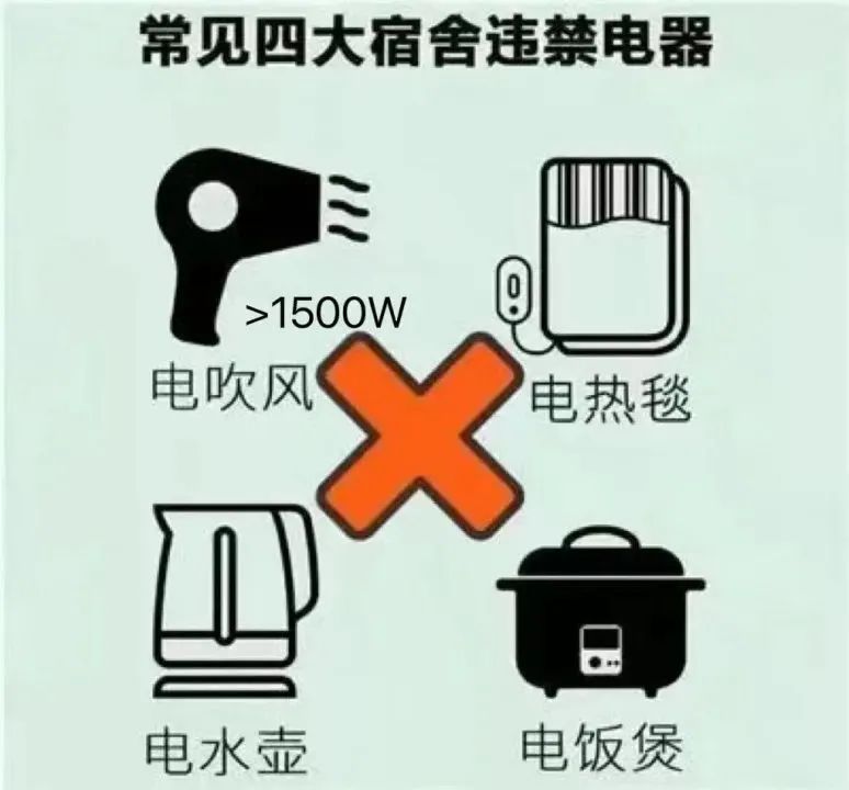 3.不要在宿舍里使用劣质电器及非安全电器,如电炉、电锅、电热杯、热得快、电热褥、取暖器、电
