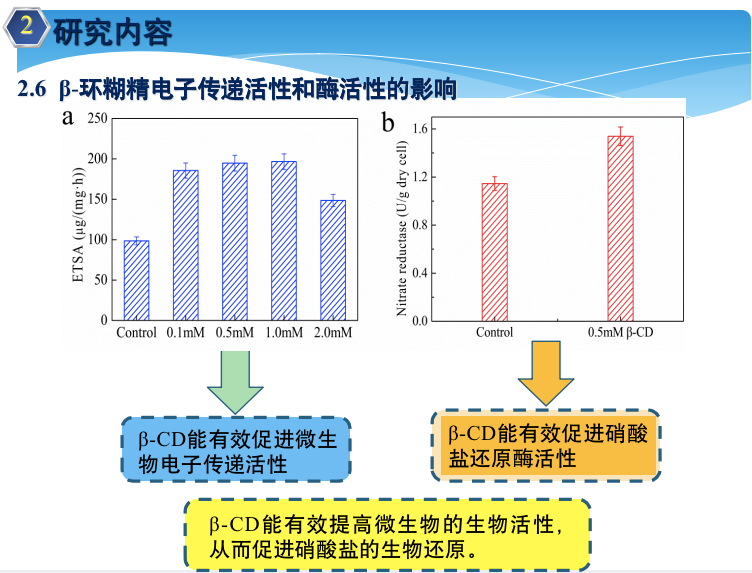 第二部分他主要介绍了生物脱氮的优势与作用机理、环糊精的发展历程及其特性、不同种类CDs对硝酸盐还原的影响、不同浓度CDs对硝酸盐还原的影响、β-CD对生物量的影响、β-CD对细胞膜通透性的影响、β-环糊精对EPS的影响、β-环糊精电子传递活性和酶活性的影响、β-环糊精强化反硝化过程机理探究。
