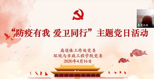4月16日中午,环境与市政工程学院党委邀请退休老党员、原学校后勤处医疗保健中心主任王宝琨老师通过腾讯会议为全院师生党员作“防疫有我,爱卫同行”主题党日活动“云”讲座。离退休工作处党委书记、处长张健胜、环境学院领导班子成员和全体师生党员共一百余人参加了本次活动。