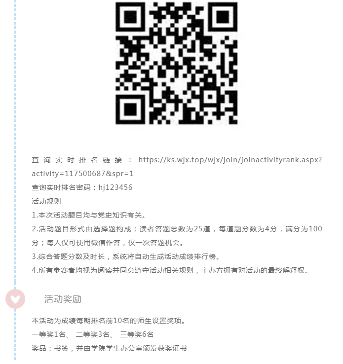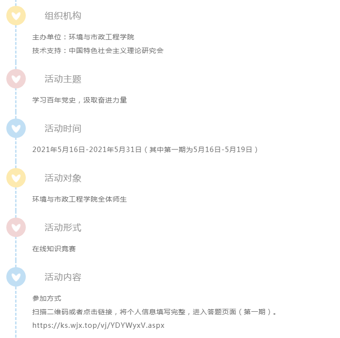2021年,中国共产党将迎来建党100周年,100年披荆斩棘,100年风雨兼程。作为新时代的青年,正处于这个历史与未来的时间的交接点。值此嘉庆之际,环境与市政工程学院举行四期主题为“学习百年党史,汲取奋进力量”的党史竞答活动,以帮助学院师生更好地了解党史,学习党史,大家积极报名,争当党史知识小达人吧!