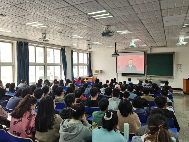 在西配203阶梯教室,学院组织近200名在校师生党员、学生团员代表一起收听收看开幕会直播,聚精会神聆听习近平总书记作报告。