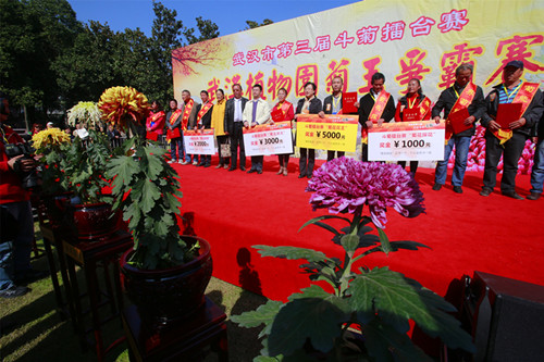 “我的是中国传统名菊,非常难养!”“我的是武汉本土菊花来打擂!”比赛现场你争我夺,好不热闹。10位选手分别介绍自己的品种,经过激烈的评比,张三军凭借“紫龙献爪”斩获“菊花花王”,获得奖金5000元和证书;“盘龙春晓”的养护者江敏华、“古刹金刚”的养护者刘庆东、“金背大红”的养护者王宏言分别揽获“菊花状元”“菊花榜眼”“菊花探花”等奖项,各获得3000元、2000元、1000元的奖金和证书。其它六个菊花的养护者获得了“菊花能手”的称号,获得奖金500元和证书一个。今年的斗菊擂台赛新设立了“最佳人气奖”,活动现场,由50位市民代表组成的大众评委为10盆菊花投票。最终,武汉本土菊花珍品“盘龙春晓”凭借超高的人气摘得这一奖项,使“菊花状元”江敏华同时揽获了“最佳人气奖”,获得奖金1000元。