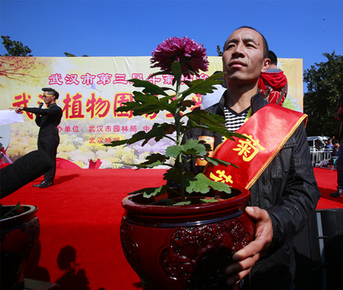 11月4日,由武汉市园林局、中囯科学院武汉植物园、武汉晚报共同举办的武汉市第三届斗菊擂台赛决赛精彩上演。10盆菊花打擂上演了精彩对决,最终,“紫龙献爪”拔得头筹,养护者张三军夺得了武汉市“菊花花王”的称号。当天上午,武汉植物园免费向市民开放,1.5万市民入园观赛共同见证了武汉市“菊花花王”的诞生。