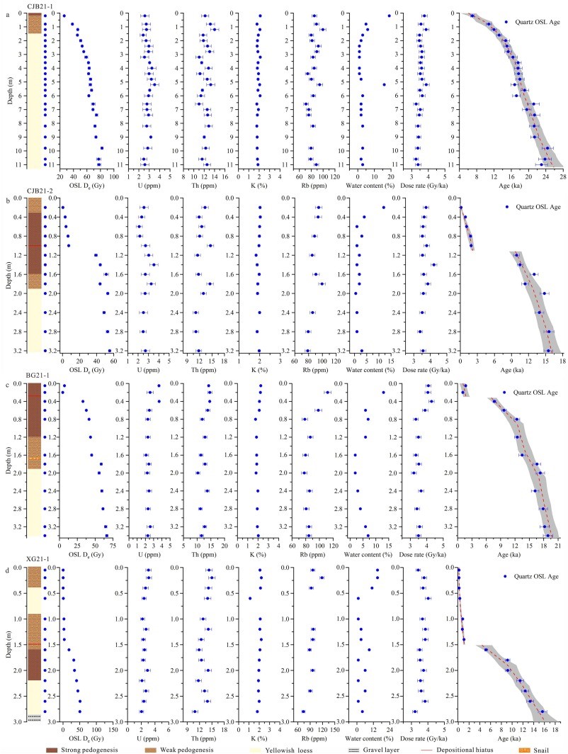 图1. 河西走廊中部4个黄土-古土壤剖面(CJB21-1,CJB21-2,BG21-1和XG21-1)样品的释光测年年龄-深度模型。