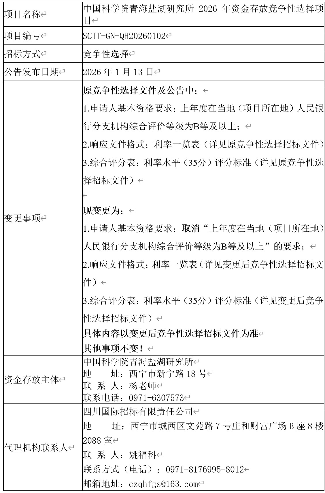 四川国际招标有限责任公司(以下均简称“代理机构”)受中国科学院青海盐湖研究所(以下均简称“询比人”)委托,已于2026年1月8日发布了中国科学院青海盐湖研究所2026年资金存放竞争性选择项目招标公告,现发布变更公告。