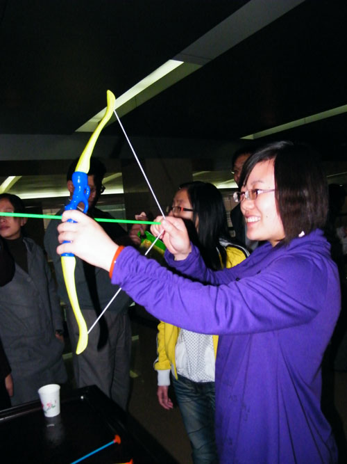 本次活动旨在增强职工之间、研究生之间以及职工与研究生的交流,强调趣味性的同时、更强调联谊性。趣味联谊活动妙趣横生,设计科学,创意十足,共设有抢凳子、夹玻璃球、扎气球、投篮、猜谜语、踩地雷、摸鼻子、吹蜡烛、掷飞镖、射箭十个项目。职工和研究生踊跃参加,多个项目举办处前都排起了长龙。大家各显神通,踩地雷讲究配合默契、掷飞镖靠个人实力、吹蜡烛拼的就是“气量”。各个项目负责人本着公正、公平、公开的原则,严格把关。每个人都保持着良好的心态,每参加一个项目,不论成功与否,都格外高兴。