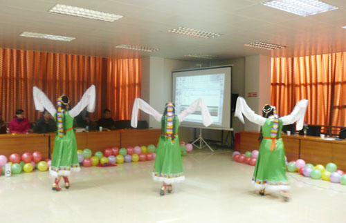 同学们一个个展示自我、放飞梦想,通过歌曲、舞蹈、舞台剧丰富多彩的节目,表达着自己热爱祖国、热爱校园之情。由袁秦、陈美达等几位同学表演的小品《嫦娥征婚记》将本次联欢会带向上了高潮。演员幽默风趣、台下笑声和喝彩声不断。伴着《高原红》激情悠扬的曲子,姑娘们舞动起别具民族风趣的舞蹈,优美的舞姿像花儿一样美。花儿开在草原上,最美的是格桑花,《高原红》和《卓玛》带来了一股清新的藏族风、浓浓的高原情。全体同学的邀请下,所长助理王永晏即兴来了一首《北京的金山上》;戈桦老师和杨青老师为大家表演了一段锅庄。联欢会结束,大家分组进行棋牌娱乐活动。