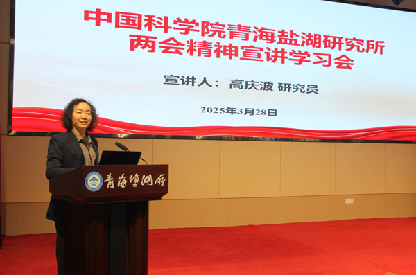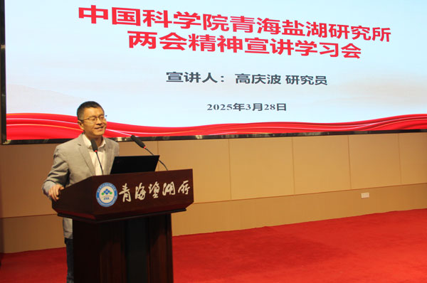 为深入学习贯彻2025年全国两会精神,全面落实习近平总书记重要讲话及政府工作报告核心要义,青海盐湖所于3月28日在学术报告厅举办贯彻落实2025年全国两会精神主题宣讲学习会。会议特邀全国政协委员、西北高原所研究员高庆波作主题宣讲,会议由党委副书记、副所长王建萍主持,青海盐湖所全体职工和研究生参加会议。