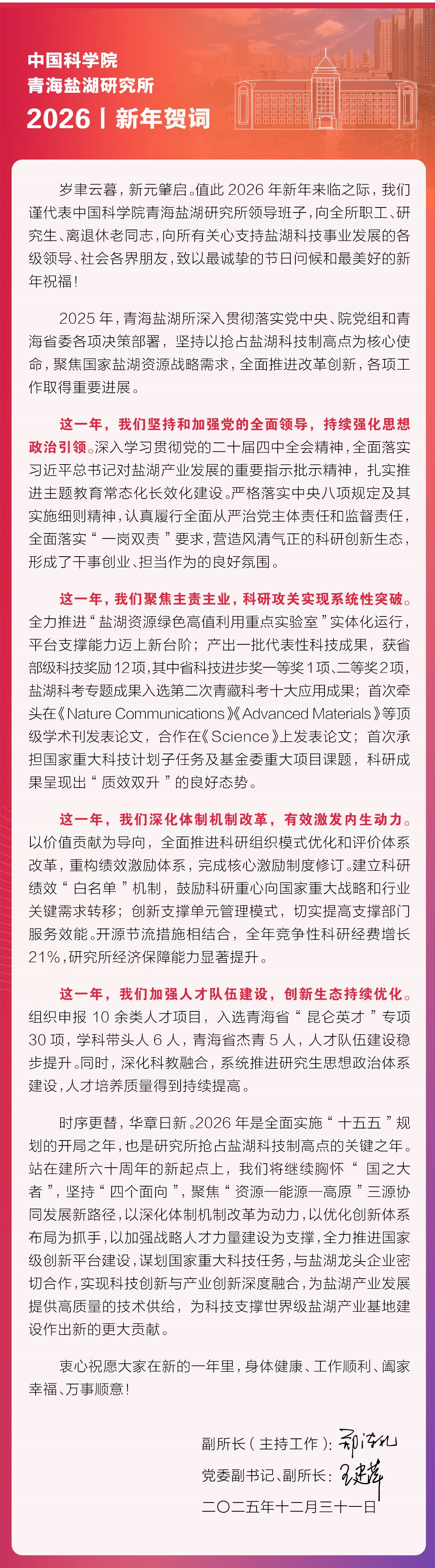 中国科学院青海盐湖研究所(以下简称:青海盐湖所)坐落于青海省省会西宁市。此地扼青藏高原东方之门户,四面环山、三川会聚;这里冬无严寒、夏无酷暑,有“中国夏都”之美称。青海盐湖所创建于1965年3月,在我国著名化学家柳大纲院士和著名地质学家袁见齐院士的带领下开始了柴达木聚宝盆的系列勘察与研究,迄今为止依然是我国唯一专门从事盐湖研究的科研机构。青海盐湖所分别于1981和1997年获得国务院学位委员会批准的硕士和博士学位授予权,现设有无机化学、地球化学两个一级学科博士学位培养专业,设有无机化学、分析化学......